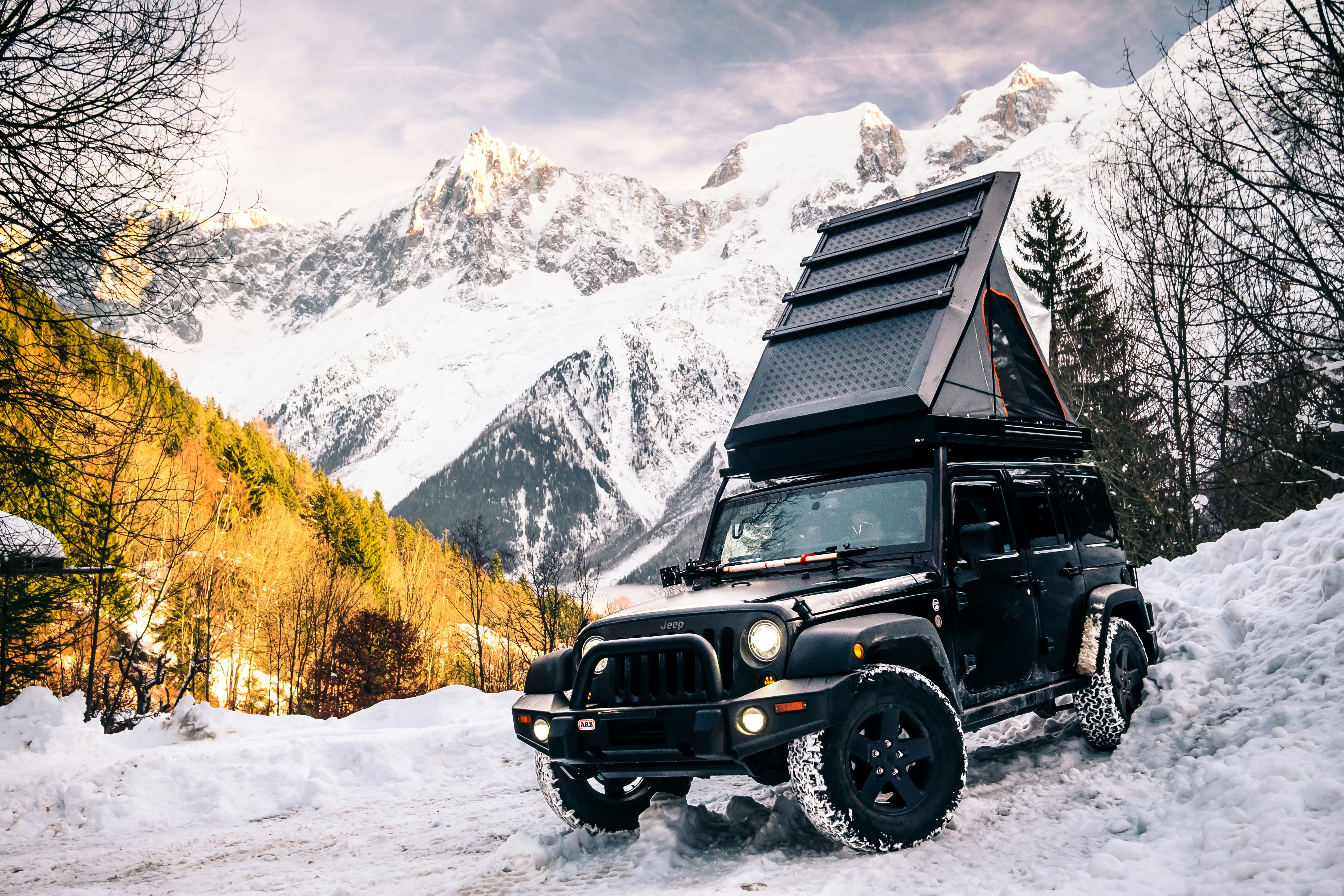 A jeep with rooftop tent in snowy mountains. by Thomas Tucker is licensed with Unsplash License