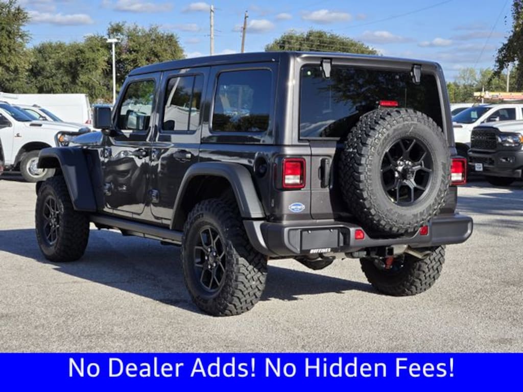 $8,705 off MSRP! Ask about our home delivery service! Touch-free car buying experience is available, call us today for details! Quick Order Package 22W Willys (4-Wheel Drive Swing Gate Decal, 7 and 4 Pin Wiring Harness, Advanced Brake Assist, Automatic Headlamps, Auxiliary Switches, Black Grille with Gloss Black Rings, Class II Receiver Hitch, Conventional Differential Front Axle, Corning Gorilla Glass, Dana M210 Wide HD Tube Front Axle, Dana M220 Wide Rear Axle, Daytime Running Lamps LED Accents, Deep Tint Sunscreen Windows, E-Locker Rear Axle, Enhanced Adaptive Cruise Control, Front LED Fog Lamps, Full Speed Forward Collision Warning Plus, Injection Molded Black Rear Bumper, LED Premium Reflector Headlamps, Mold in Color Bumper with Gloss Black, Molded in Color Rubicon Highline Flare, MOPAR All-Weather Floor Mats, Off-Road Plus Mode, Power Heated Mirrors, Premium Wrapped Steering Wheel, Security Alarm, Sun Visors with Illuminated Vanity Mirrors, Wheels: 17" x 7.5" Painted Black, Willy's Suspension, and Willys Hood Decal), Steel Power Dome Hood Package (Power Dome Dual Vented Hood), 12.3" Touchscreen Display, 4-Wheel Disc Brakes, 4G LTE Wi-Fi Hot Spot, 8 Speakers, ABS brakes, Air Conditioning, AM/FM radio: SiriusXM with 360L, Apple CarPlay, Apple CarPlay/Android Auto, Aux Battery, Brake assist, Compass, Connectivity - US/Canada, Delay-off headlights, Driver door bin, Driver vanity mirror, Dual front impact airbags, Dual front side impact airbags, Electronic Stability Control, For More Info, Call 800-643-2112, Front anti-roll bar, Front Bucket Seats, Front Center Armrest w/Storage, Front fog lights, Front reading lights, Google Android Auto, Illuminated entry, Integrated Center Stack Radio, Integrated roll-over protection, Jeep Trail Rated Kit, Low tire pressure warning, Manufacture Statement of Origin, Non-Lock Fuel Cap Without Discriminator, Normal Duty Suspension, Occupant sensing airbag, Outside temperature display, Overhead airbag, Panic alarm, ParkView Rear Back-Up Camera, Passenger door bin, Passenger vanity mirror, Power steering, Power Top Quarter Window Storage Bag, Power windows, Radio data system, Radio: Uconnect 5 with 12.3" Display, Rear anti-roll bar, Rear reading lights, Rear Window Defroster, Rear Window Wiper/Washer, Remote keyless entry, Removable Rear Quarter Windows, SiriusXM Radio Service, SiriusXM with 360L, Sky One-Touch Power Top, Speed control, Split folding rear seat, Steering wheel mounted audio controls, Stop-Start Dual Battery System, Tachometer, Telescoping steering wheel, Tilt steering wheel, Traction control, Trip computer, Variably intermittent wipers, and Wheels: 17" x 7.5" Black Steel Styled.